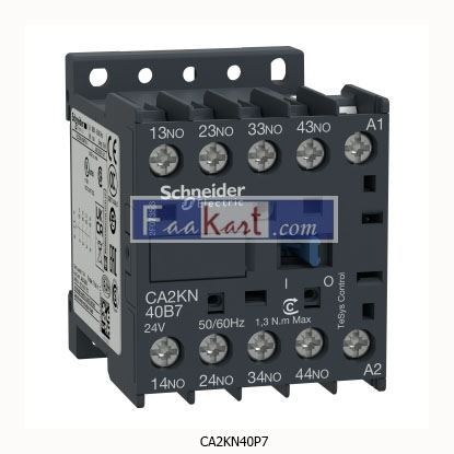 TeSys K control relay, 4 contacts (4NO), 10A/690V, for control of electromagnetic loads AC-15/DC-13. It provides a 230V 50/60Hz AC control circuit, connection by screw clamp terminals. For high operating rates until 180 cycles/min and ambient temperature -25/+50°C, it procures high reliability and durability. Compact (45mm width), for clipping on 35mm DIN rail or fixing by screw.